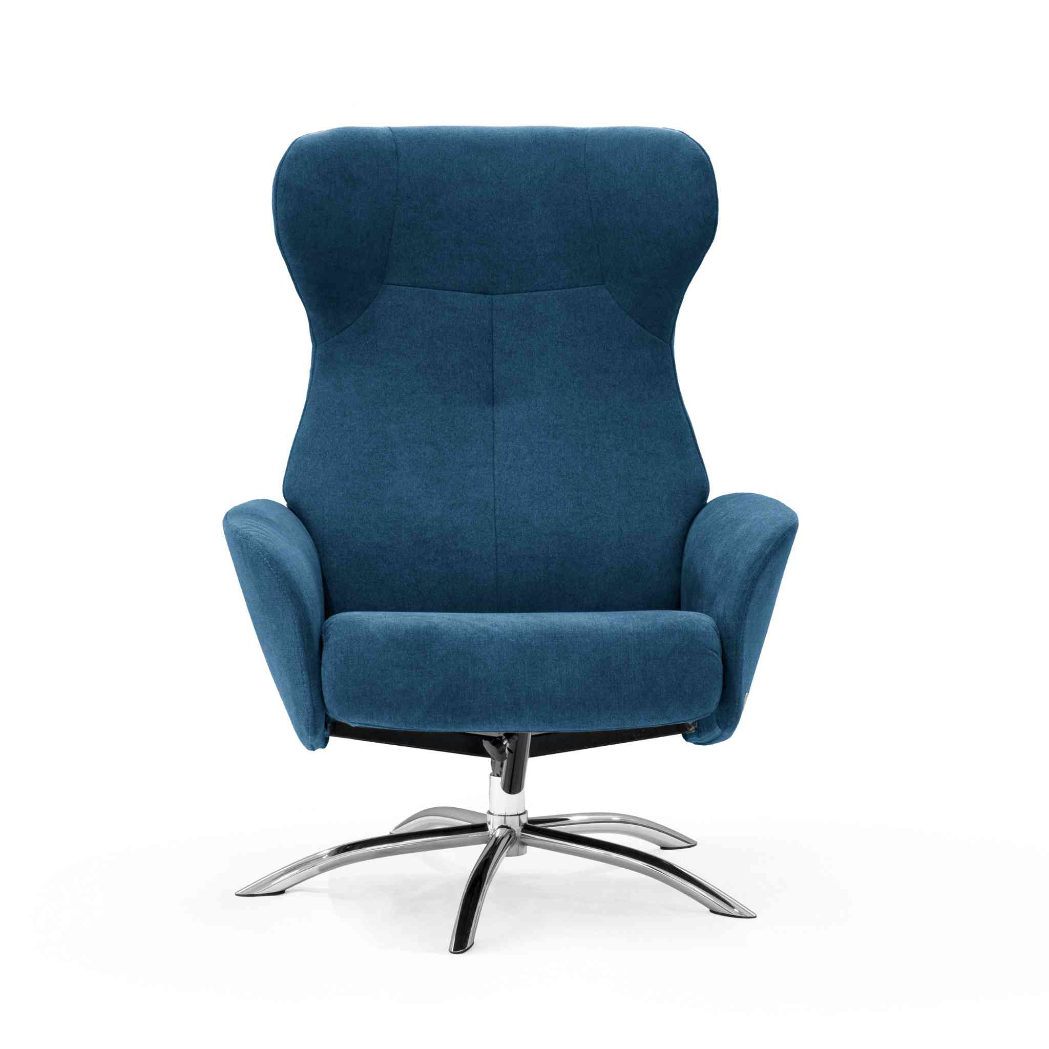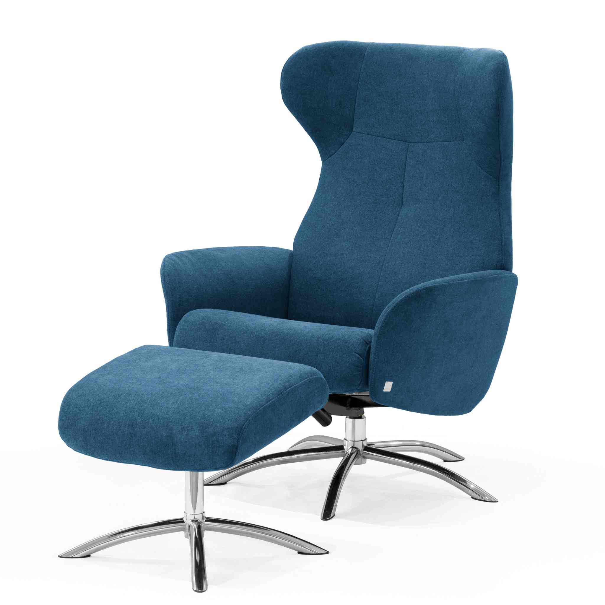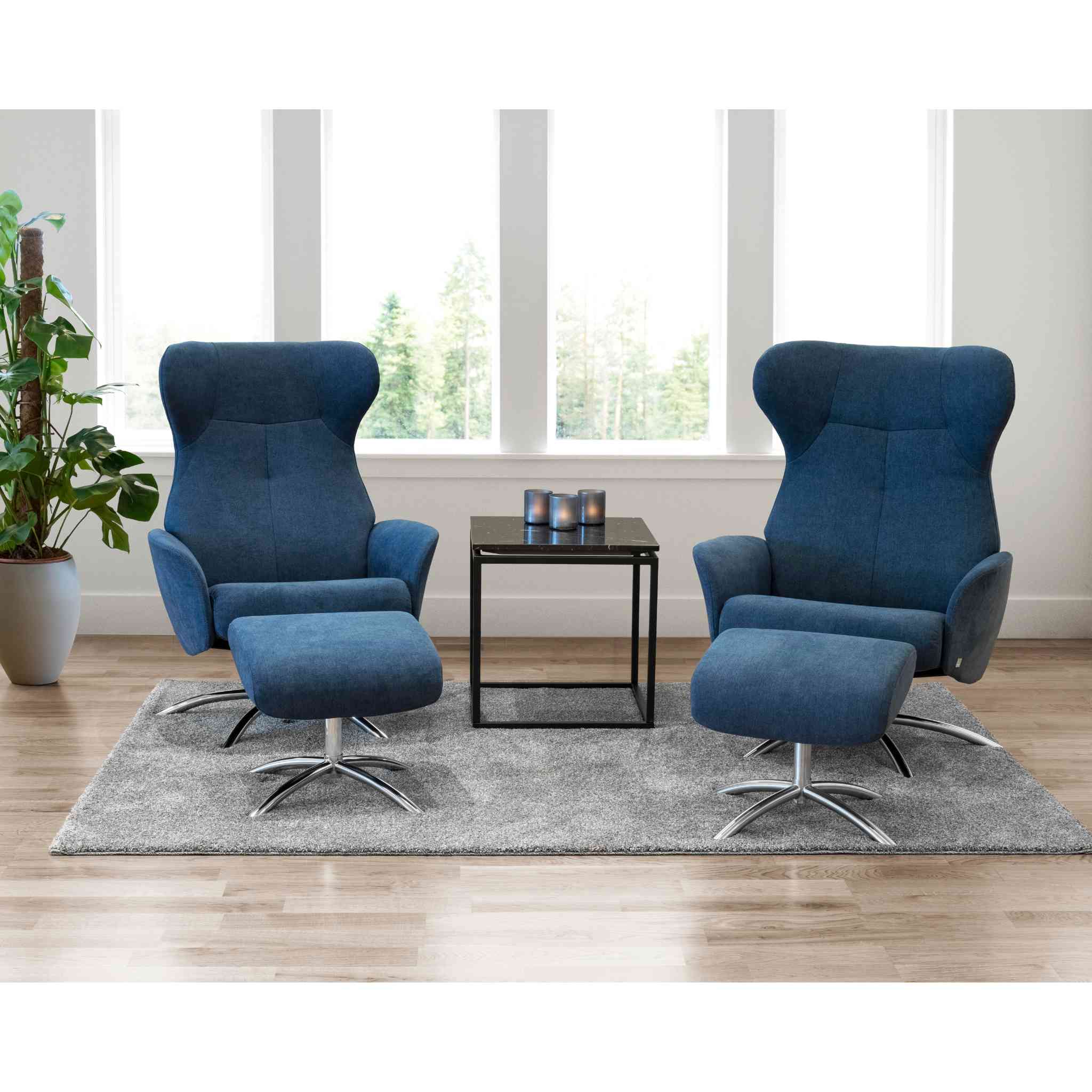 Stolen er her vist med Mine Blue stof og chrome sokkel.